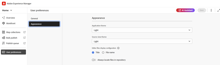 Appearance: The Appearance tab provides you with the options to select the themes for the application and the source view of the content editing area. Use this tab to configure the following settings: