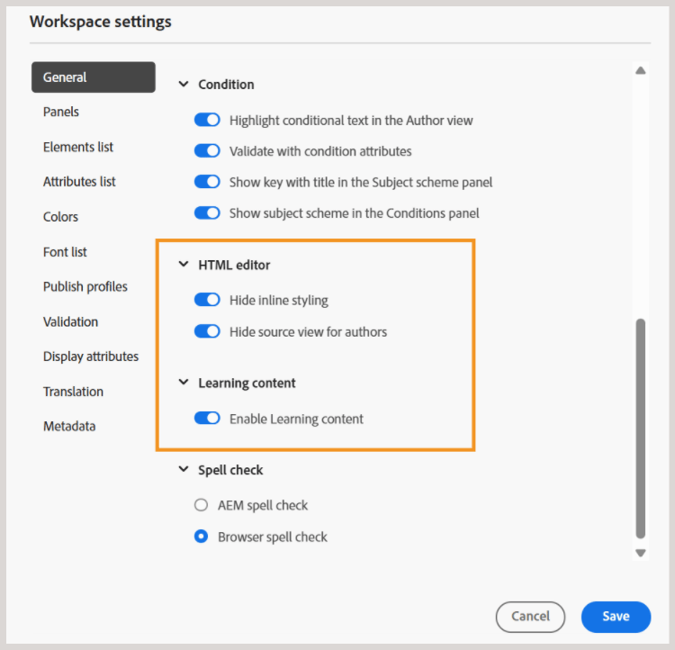 HTML editor: This setting allows you to configure the Editor for HTML-based authoring. Key configuration options present in this setting are as follows: