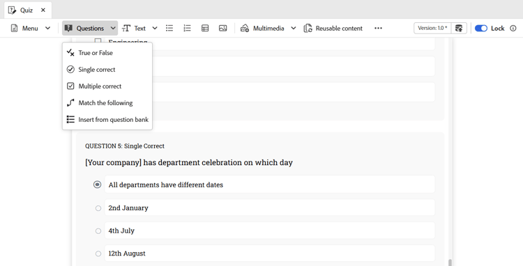 - Knowledge check: Add quick, non-graded quizzes within the learning topics to validate learner’s understanding.
