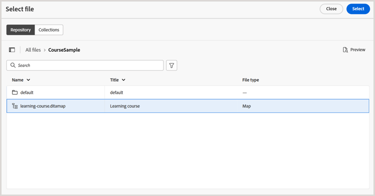 In the Select file dialog, navigate to the content location and select the desired Learning content.