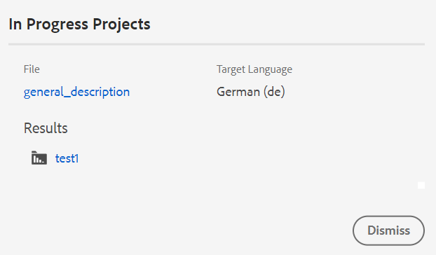 Some of the references on your translation dashboard might be in progress status. These references have a In Progress link under Translation Status column. When you select the link, the In Progress Projects dialog opens. In the dialog, you can view the list of all In Progress translation projects (along with the target language) which contain the selected reference.