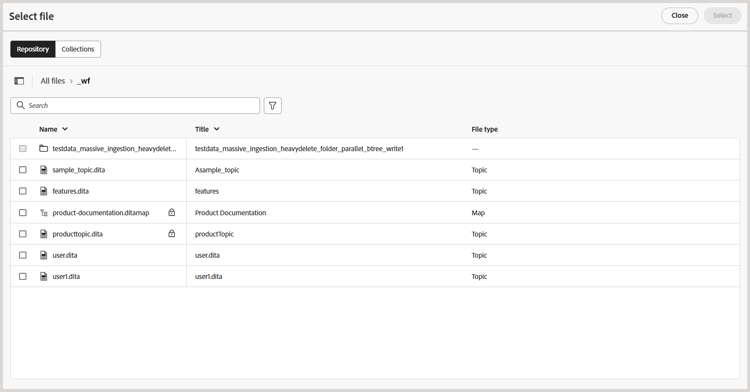For authoring, publishing, and translation tasks, you are prompted to select the location of the required file in the Select file dialog. The selected file (a topic for authoring and map for publishing and translation) is added to the task as soon as the Create button is selected.