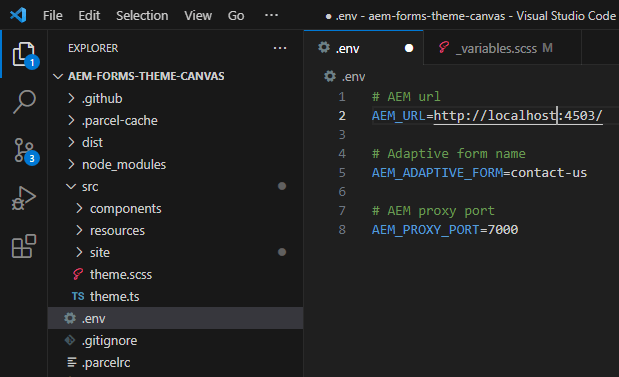 Use the following command in the listed order to navigate to the aem-forms-theme-canvas directory and open Visual Studio Code.