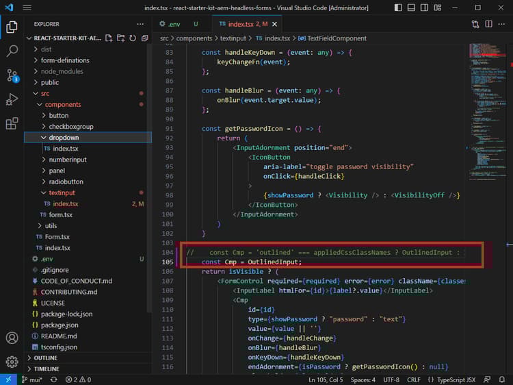 //at the beginning of the code line 104. It converts the line to a comment.code language-shell //const Cmp = \'outlined\' === appliedCssClassNames ? OutlinedInput: Input; -