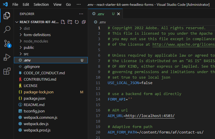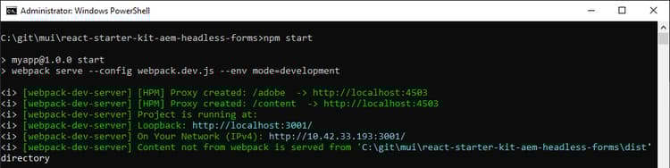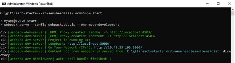 Open the command window, ensure you are at the react-starter-kit-aem-headless-forms directory, and run the following command: