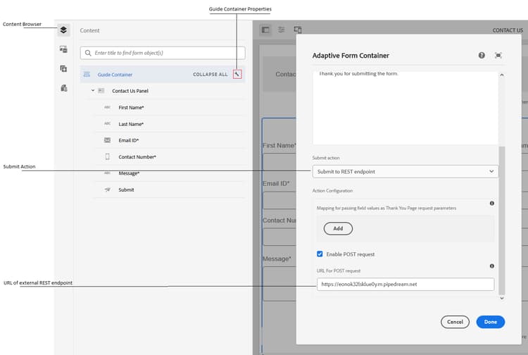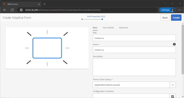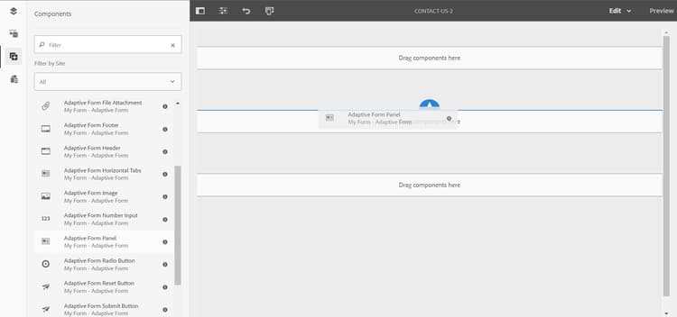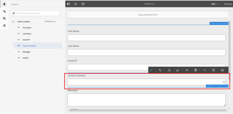 Select the Contact Us form and click Edit. It opens the form in the Adaptive Forms editor.