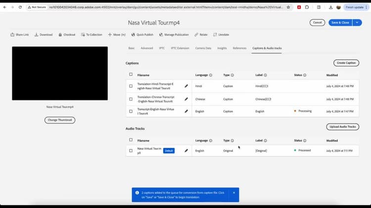 Closed captions are auto-generated once a video file is uploaded to AEM Assets with Dynamic Media.