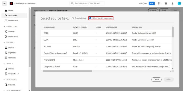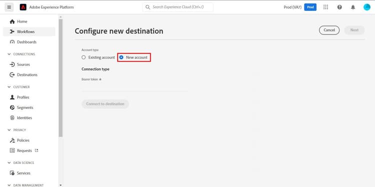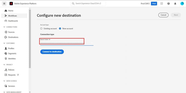 Within the Adobe Experience Platform console, navigate to Destinations.