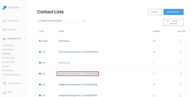 The SendGrid Marketing Lists > Create List API is used to create unique contact lists within SendGrid by joining the value of the list_name attribute and the timestamp of the data export. Navigate to the SendGrid site and check if the new contact list conforming to the name pattern is created.