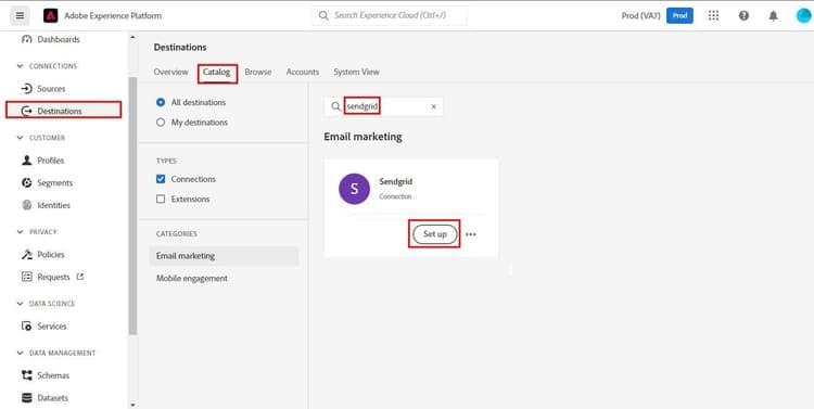 Select the Catalog tab and search for SendGrid. Then select Set up. After you have established a connection to the destination, the UI label changes to Activate Segments.
