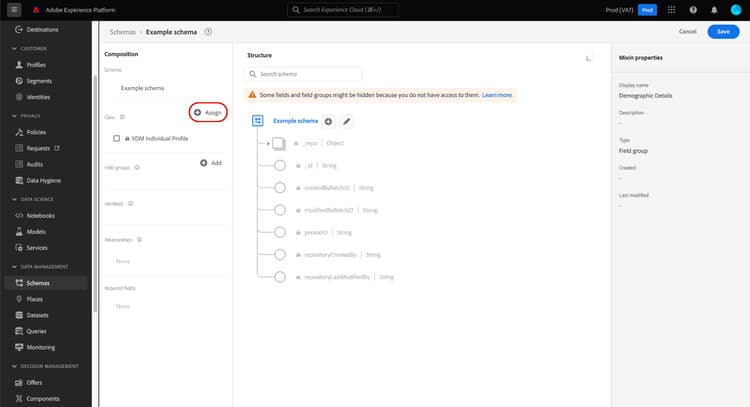 Once you have assigned a class and added field groups to a schema, you can edit the display names of any of the schema’s fields, regardless of whether those fields have been provided by standard or custom XDM resources.