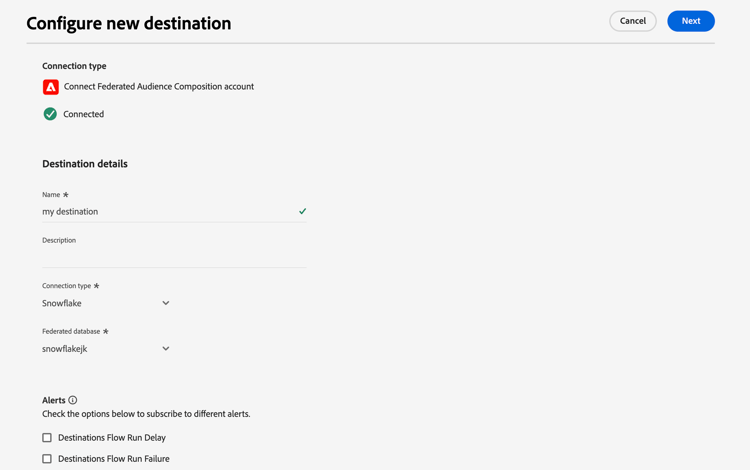 In the Alerts section, you can enable alerts to receive notifications on the status of the dataflow to your destination.