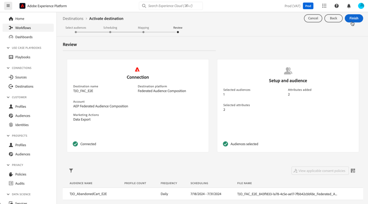 To do so, you need to setup a new connection in Adobe Experience Platform to the Adobe Federated Audience Composition destination. You can use a scheduler to send a given audience at regular frequencies, select specific attributes to include, such as IDs for data reconciliation. If you have applied governance and privacy policies to your audience, they will be kept and sent back to the audience portal once the audience has been updated.