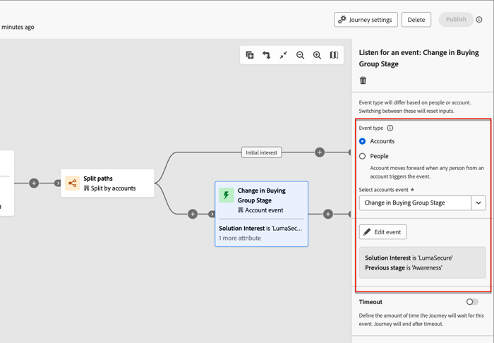 Use the occurrence of a buying group stage change to move the account forward to the next step in the journey. Defining this node involves selecting the solution interest and additional constraints to satisfy the event trigger.