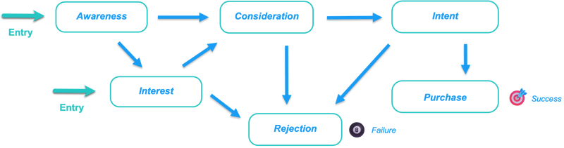 Transition rules determine how a buying group can move from one stage to another. For example, it can move from an entry stage to a middle stage, and from a middle stage to various other stages. An entry stage is an initial stage that a buying group can enter from a blank state, and destination stages are classified as success or failure stages.
