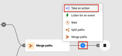 Click the plus ( + ) icon on a path and choose Take an action.
