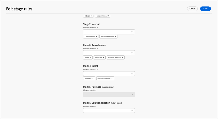 Define the stages within a single staging model, defining multiple stages and the transition flow between them. One or more stages are designated for entry into the lifecycle. The model also allows for non-linear progression, where you can specify transitions from one stage to another, such as from stage A to stages B, C, or D. It is required that one stage is designated as the success stage, such as a purchase or signed contract. It is optional that another stage be designated as a failure stage, such as a rejected contract or purchase of a competing solution from another vendor. Monitor these stages through intelligent dashboards that show how buying groups are progressing in terms of completing a sale opportunity or converting an opportunity into a customer.