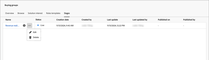 You can delete the buying group stages model when it is in a draft or published state. If it is published (live), you can delete it only when it is not associated with a solution interest.