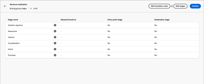 As long as the buying group stages model remains in a Draft state, you can edit the stages and transition rules.