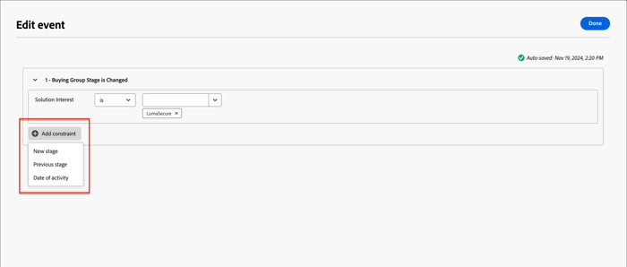 Click Add constraint and select the buying group stage change that you want to use for triggering the event.