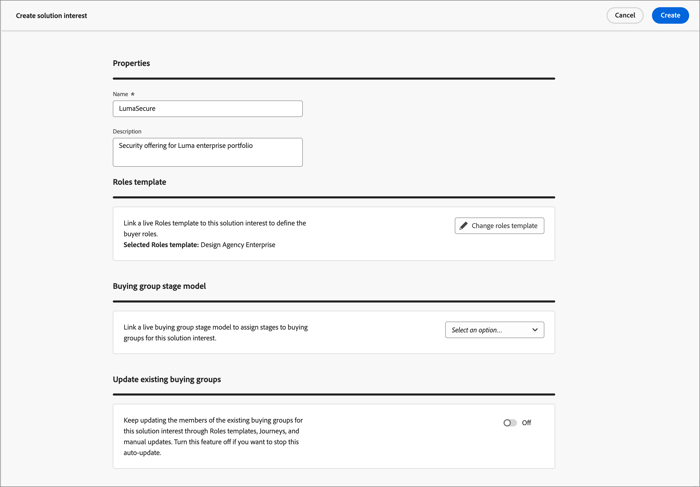 Before you create a solution interest, you must have a live (published) roles template that defines the roles you want to target. See Buying Group role templates for more information about creating a roles template and publishing a roles template.
