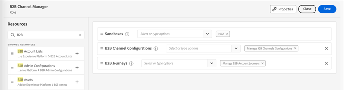 In the following example, you want to add permissions related to the B2B Journeys resource for users assigned to the B2B Channel Manager role. This change enables users for that role to manage account journeys also.