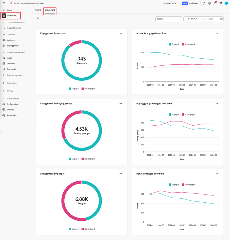This dashboard provides a comprehensive view of engagement and showcases real-time metrics of account and individual interactions through snapshot donut charts and trend-revealing line charts over time. It helps you monitor and strategize your engagement efforts effectively.