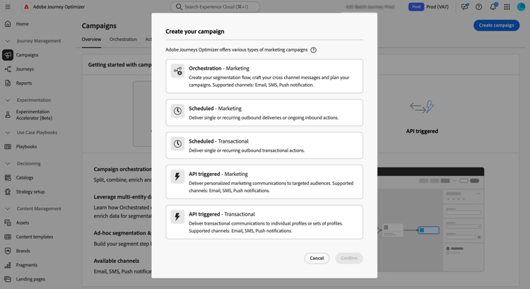 Journey Optimizer supports three campaign types. Each type fits different use cases and supports different channels.