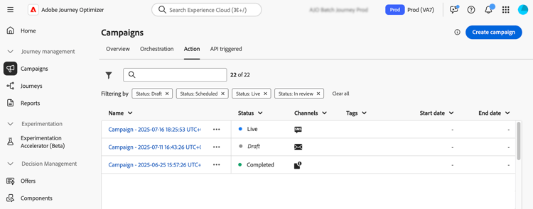 Permissions - Campaigns are only available to users with appropriate permissions listed below. If you are unable to access campaign functionalities, please contact your administrator to request the necessary permissions. Learn more about Journey Optimizer built-in roles