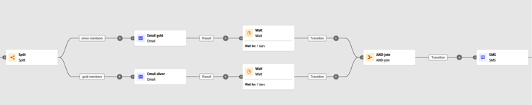 This example illustrates two coordinated campaign branches, each featuring an email delivery, one targeting gold members and the other silver. The AND-join activates once both incoming transitions are triggered, and the SMS will be sent only after both email deliveries are completed, following a 7-day delay.