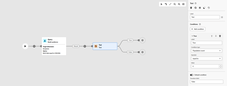 The Test activity is a Flow control activity. Use it to branch your campaign flow by activating different transitions depending on conditions you define. Each condition can evaluate data from the inbound transition and you can choose which transition runs first by the order in which conditions are evaluated.