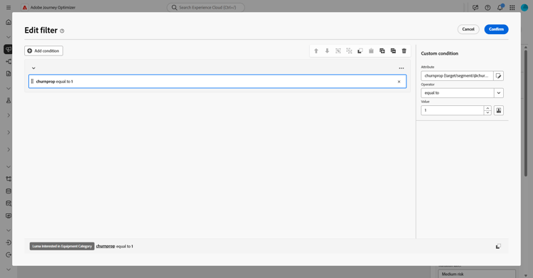 For customers identified as having a high risk of churn, create a dedicated audience segment. This audience is later used for separate, targeted communication.