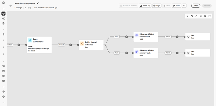 Next, add a Split activity to segment customers by their likelihood of churn, allowing you to deliver personalized experiences tailored to each customer group.