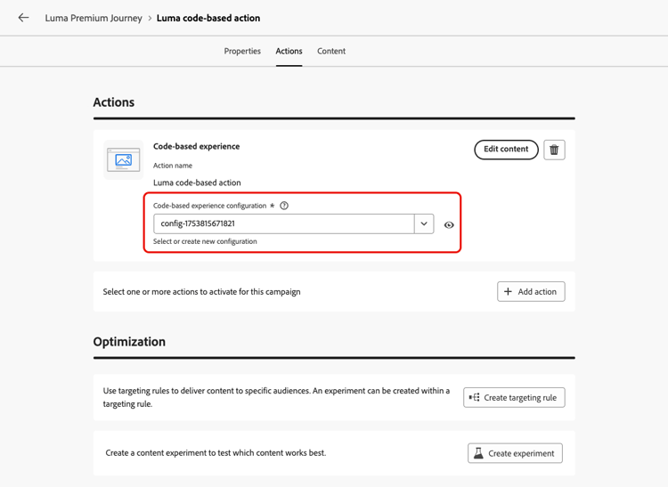 You are directed to the Actions tab. From there, select or create the code-based experience configuration to use. Learn more