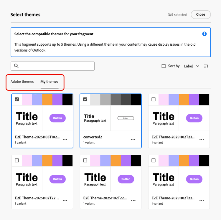 You can navigate between the Adobe themes and My themes tabs, and select up to five compatible themes (from both tabs) for your fragment.
