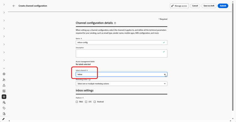Before you can deliver Content card experiences through the Inbox, you must define an Inbox channel configuration in Channel configurations. That configuration ties the surface to consent, optional access labels, and where the experience appears on the web or in your iOS or Android app. Follow the steps below to create a configuration:
