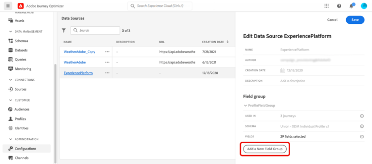 Adobe Experience Platform data source defines the connection to Adobe Real-time Customer Profile. This data source is built-in and pre-configured, and cannot be deleted. This data source is designed to retrieve and use data from the Real-time Customer Profile Service (for example, check if the person who entered a journey is a female). For more information about Adobe Real-time Customer Profile, refer to Adobe Experience Platform documentation.