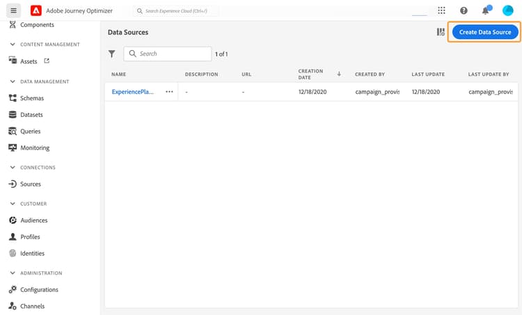 External data sources allow you to define a connection to third-party systems, for example if you are using a hotel booking system to check if the person has registered a room. As opposed to the built-in Adobe Experience Platform data source, you can create as many external data sources as you need.