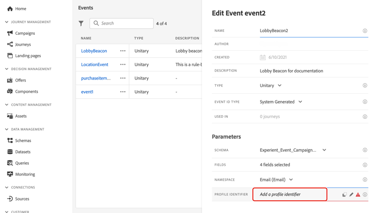 The profile identifier allows the system to perform the reconciliation between the event and the individual’s profile. If you select a schema that has a primary identity, then the Profile identifier and Identity type fields are pre-filled. If there is no identity defined, the identityMap > id is the primary key. Then you must select an identity type, and the key is automatically pre-filled using identityMap > id.