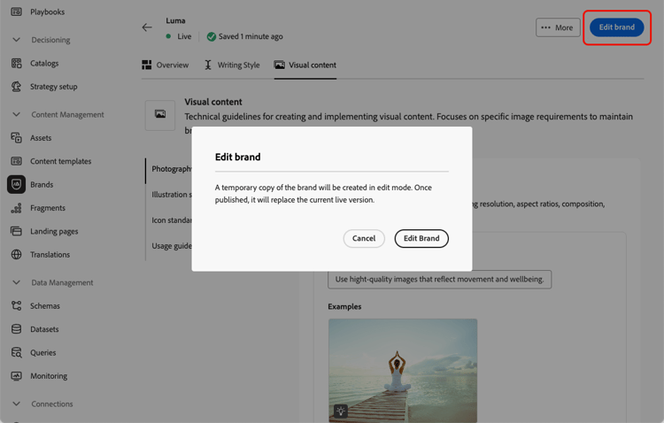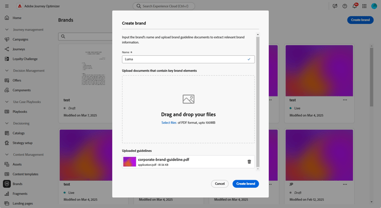 In Journey Optimizer, you now have the option to manually input and organize your brand details or upload brand guideline documents for automatic information extraction.