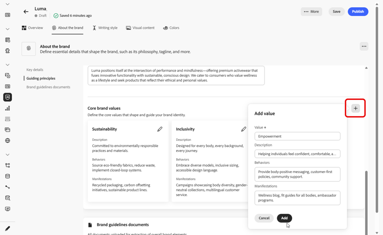Use the About the brand tab to establish the core identity of your brand—outlining its purpose, personality, tagline, and other defining attributes.
