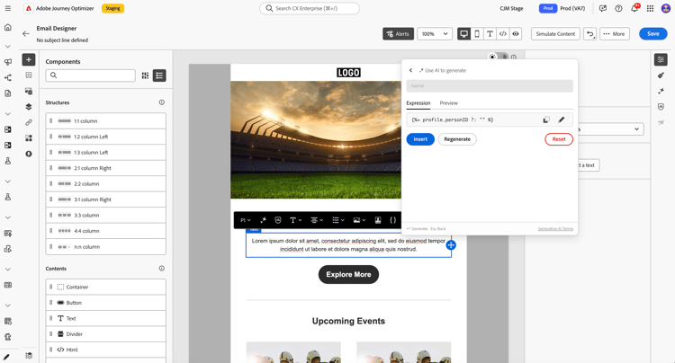 AI Assistant for personalization expressions is also available directly from the inline editing experience in the Email Designer, without opening the full Personalization Editor. The generated expression is inserted at the cursor position in the text component.
