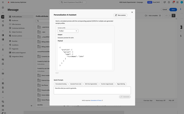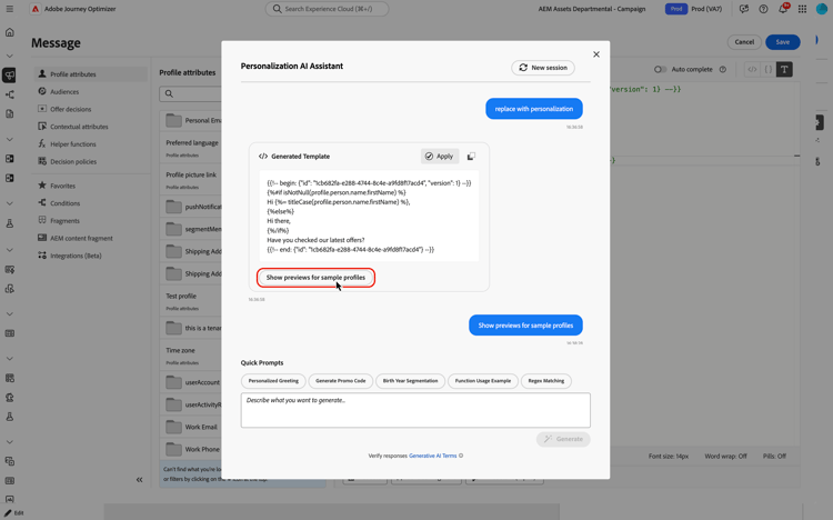 note NOTE Additional previews are for spot checking. The assistant is tuned to generate roughly one to five profiles, asking for a very large number may cause the request to fail. note NOTE This control is for a quick check of your personalization code in the editor — not a full message preview of your content. For complete validation of the experience, use your usual simulation flow. Learn how to preview & test your content -