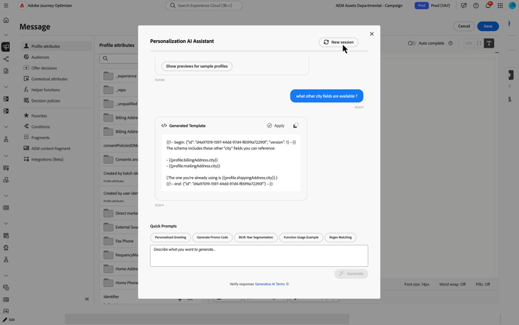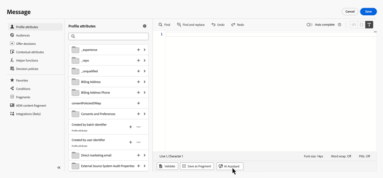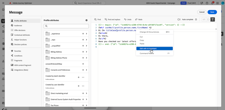 Depending on your campaign or journey context, the assistant can work with data and constructs the Personalization Editor already exposes — for example profile attributes, segment membership, helper functions, and related personalization sources.