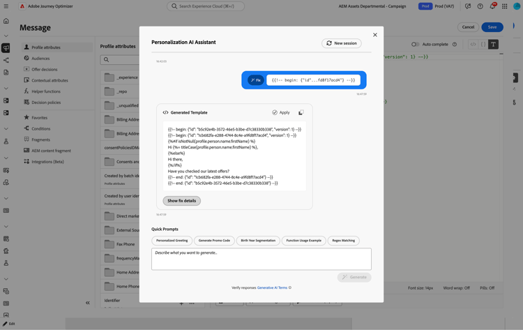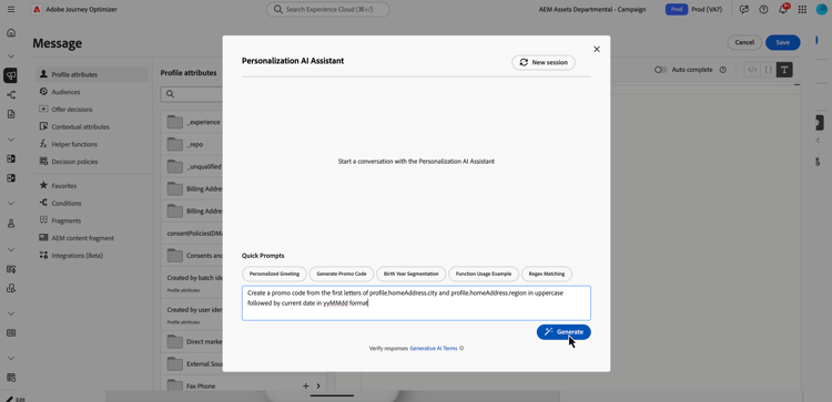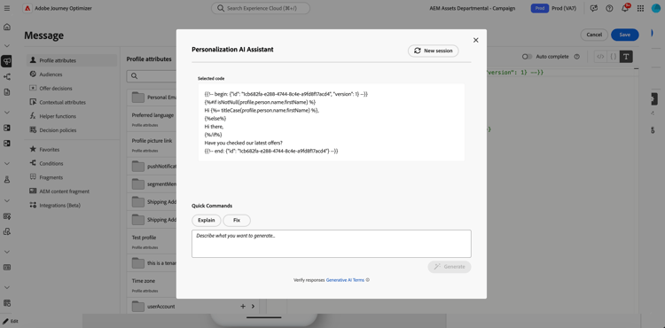 AI Assistant helps you generate new personalization from plain language, explain what existing expressions do, and fix issues in selected code, so that you spend less time on syntax and manual field discovery. You can also iterate on a selection or ask for other changes in conversation. It is available from two entry points: