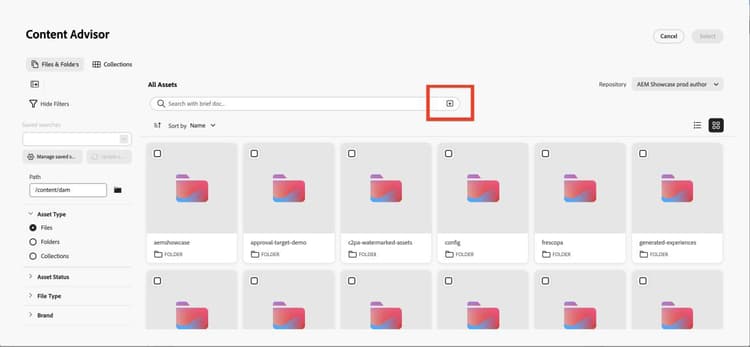 Upload a marketing brief document to automatically surface assets that align with your campaign context. The AI analyzes your brief and suggests relevant assets based on the content and requirements described in the document.