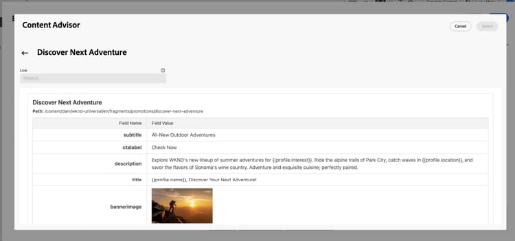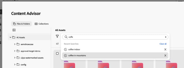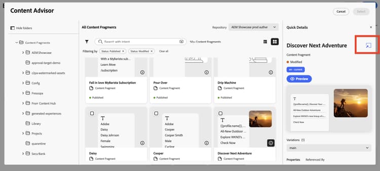 Adobe Experience Manager Content Advisor replaces deterministic discovery with standardized intent-driven discovery from a unified surface. It enables unified, AI-powered discovery of Assets and Content Fragments directly within Journey Optimizer authoring workflows, improving marketer productivity and campaign efficiency.
