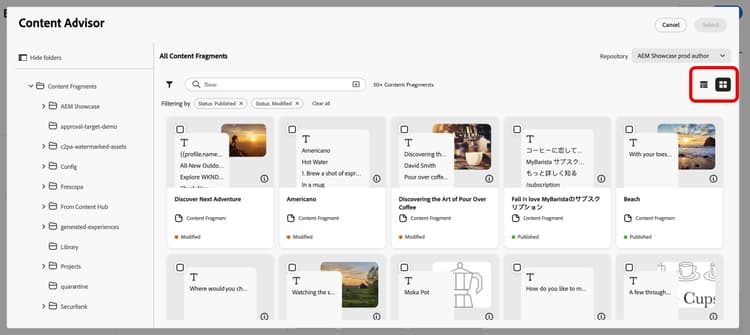 Switch between thumbnail and table views to browse Content Fragments in the format that works best for your workflow. Thumbnail view provides visual context, while table view shows detailed information in a structured format.