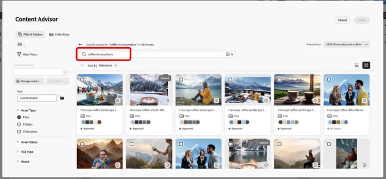 Search for assets using natural language instead of exact keywords or file names. Describe what you need in plain language, for example “coffee in the mountains”, and the AI finds contextually relevant assets based on meaning and content, not just text matches.