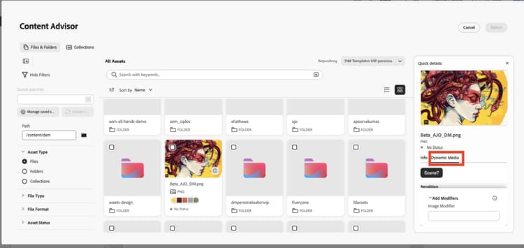 The Dynamic Media panel provides access to dynamic renditions, smart crops, and on-the-fly modifications. You can enter modifiers directly in the panel to create custom renditions.